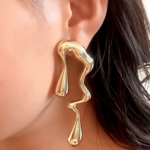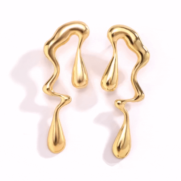 My wife's wardrobe has been enhanced by these gold-toned earrings, featuring a distinctive asymmetrical, liquid-like design. Crafted from stainless steel, these drop earrings are a striking addition to both her formal and casual attires, making them a versatile accessory.